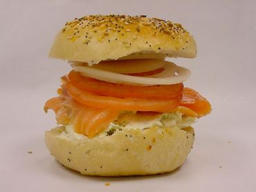 with fresh nova lox, cream cheese, onions, tomatoes and capers